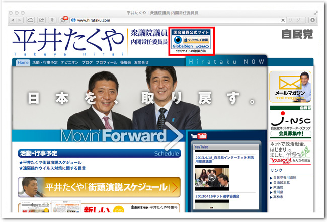 自民党 ネットメディア局長の平井たくや先生とネットメディア局次長の中川俊直先生 のwebにGMOグローバルサインの「なりすまし防止シール」をご導入頂きました。グループを挙げて安全・安心なネット選挙の解禁に尽力致します。